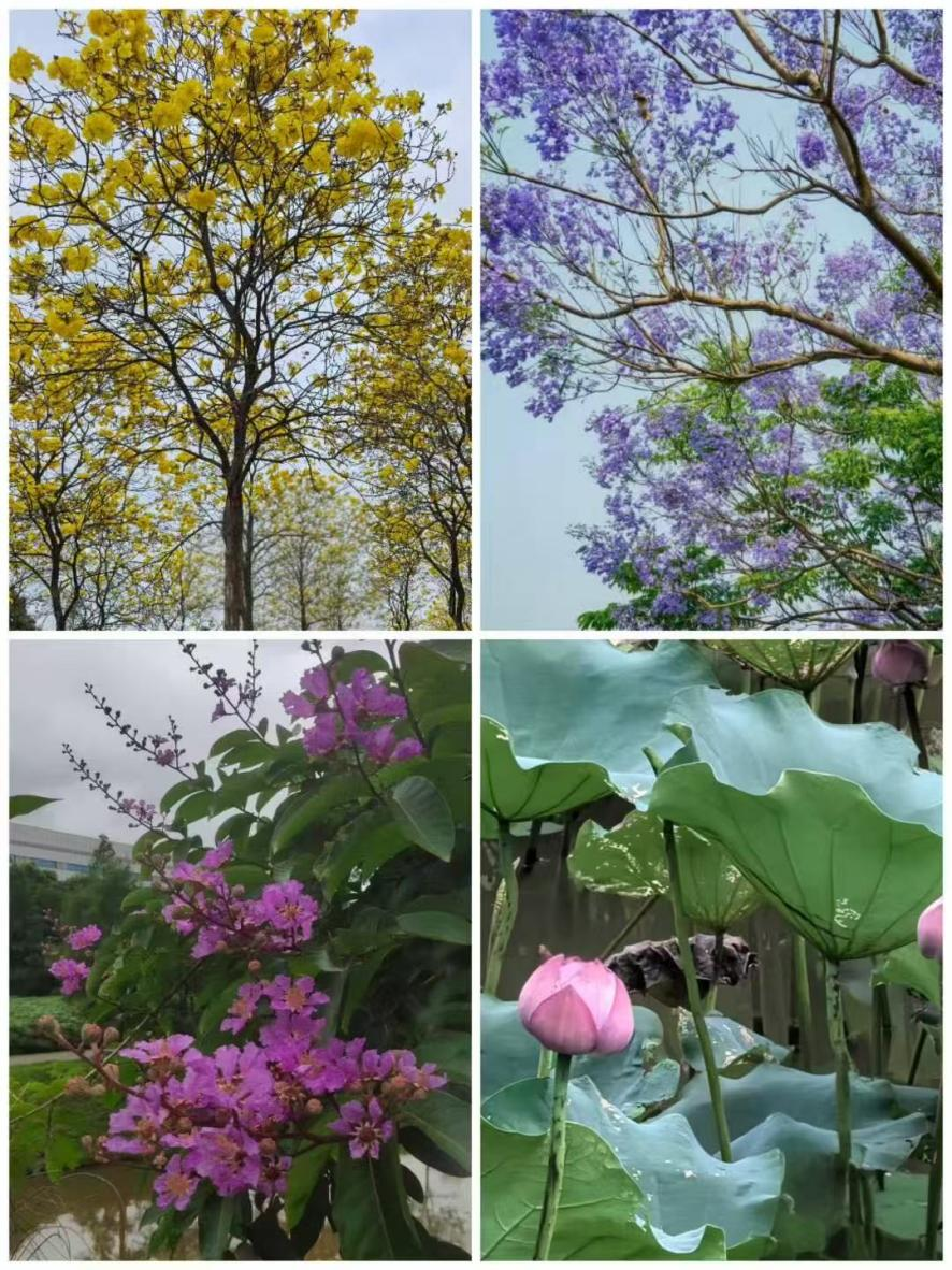 华阳湖畔的蓝最是动人的。湖水碧蓝,岸边几株异木棉花开得火红,间杂几株黄槐,将天空映得愈发湛蓝。闲时我喜欢登上腾龙阁,坐在长椅上,看树影在水面游移。风起时,黄的紫的红的花簌簌落下,竟像是从蓝天里飘下来的。